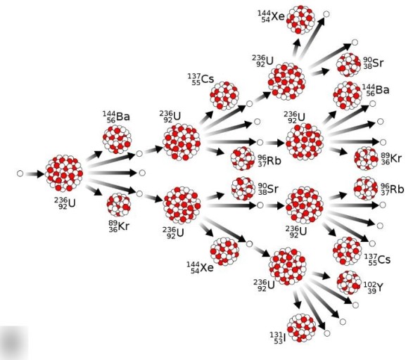 . 핵분열: 핵분열은 무거운 원자핵(예: 우라늄-235 또는 플루토늄-239)이 중성자와 충돌하여 두 개의 더 가벼운 원자핵으로 나뉘면서 에너지를 방출하는 과정입니다.